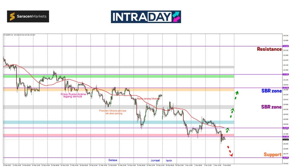 Kenaikan harga dilihat akan menguji beberapa paras penting seperti paras 128.00 dan zon SBR (support become resistance) pada 129.500.