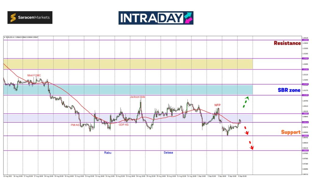 Jika diperhatikan pergerakan harga pada carta pasangan mata wang EUR/USD, harga memulakan dagangan di awal minggu dengan penurunan mencecah paras terendah terbaru 22 tahun ke paras jangkaan 0.98800 yang menjadi support terbaru buat harga.