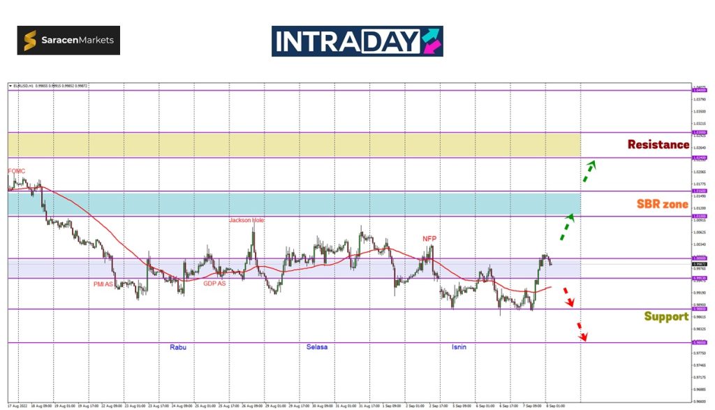 Kenaikan harga jika diteruskan menjauh dari paras pariti 1.0000 seterusnya dilihat akan menguji rintangan pada 1.01000 pada zon SBR (support become resistance) tersebut.