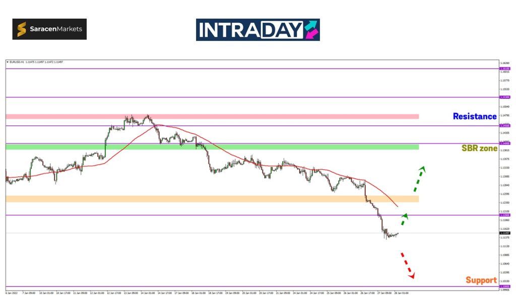 Pada carta harga utama pasangan mata wang EUR/USD, harga dilihat telah menyambung penurunan lebih rendah sehingga melepasi zon support penting 1.12000.