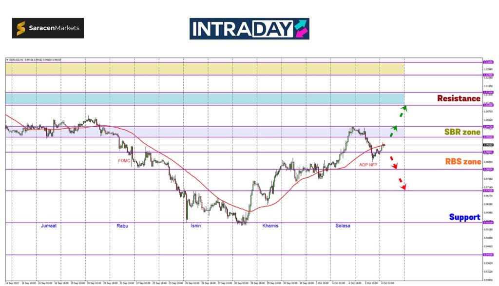 Penurunan harian dicatatkan sekitar 150 pips pada Rabu semalam ke paras sekitar 0.98400 dan dilihat harga telah susut di bawah paras halangan Moving Average 50 (MA50) pada rangka masa 1 jam di carta EUR/USD di sesi New York semalam.