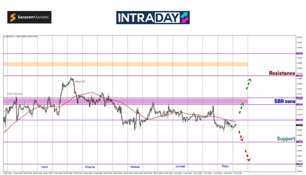 Sebaliknya jika pergerakan harga mula memberi isyarat untuk perubahan trend bullish dengan kenaikan di atas paras 1.31000 melepasi halangan MA50, harga bakal menuju semula ke zon rintangan pada 1.31700-1.3200.