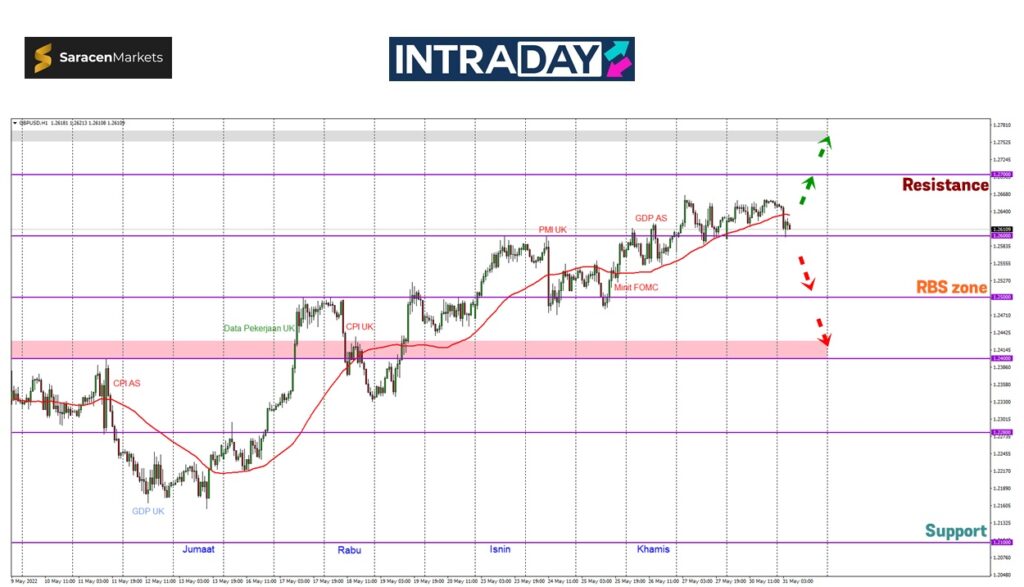 Sekiranya ternyata harga membuat penurunan dan susut melepasi paras 1.26000, harga berkemungkinan turun menuju sehingga ke paras 1.25000 untuk menguji zon RBS (resistance become support) tersebut.