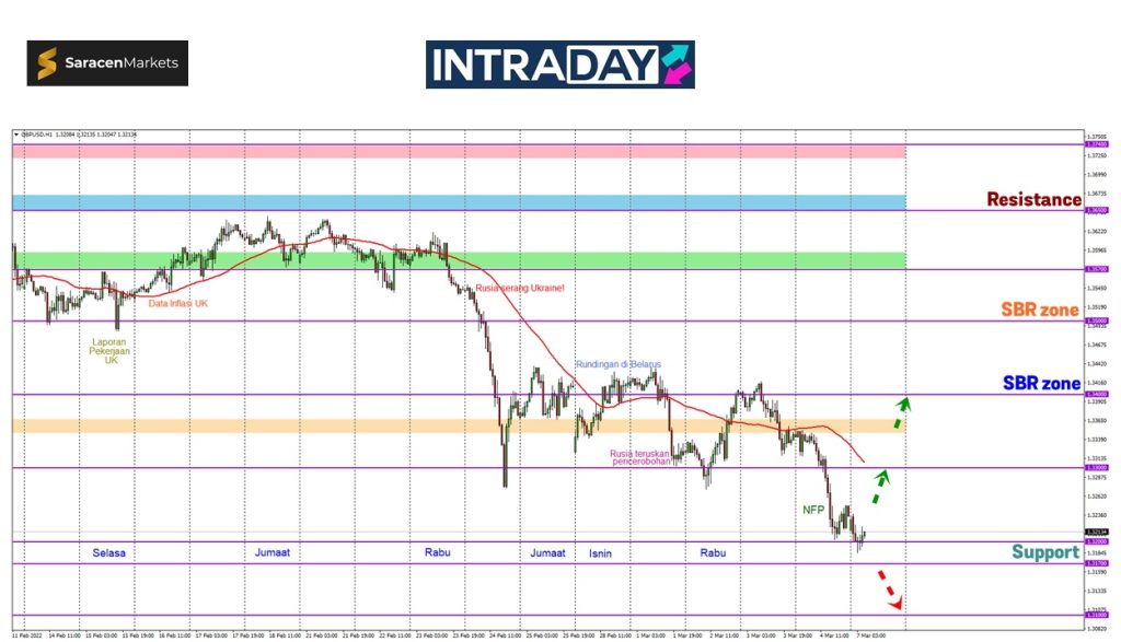 Sekitar zon 1.32000-1.31700 akan menjadi zon penting yang turut diuji harga pada dagangan sesi Asia pagi Isnin ini dengan jangkaan harga bakal menembusinya jika US dolar berjaya mengekalkan pengukuhan.