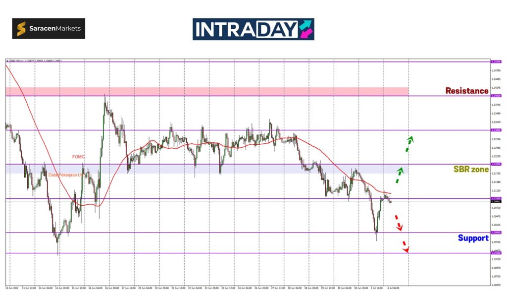 Sekiranya harga menyambung semula penurunan lanjut, dilihat zon support 1.20000 harga bakal diuji semul sebelum harga yang meneruskan penurunan pada trend bearish seterusnya bakal menuju pula ke paras 1.19400 yang pernah dicecah harga pada dagangan pertengahan Jun lalu.