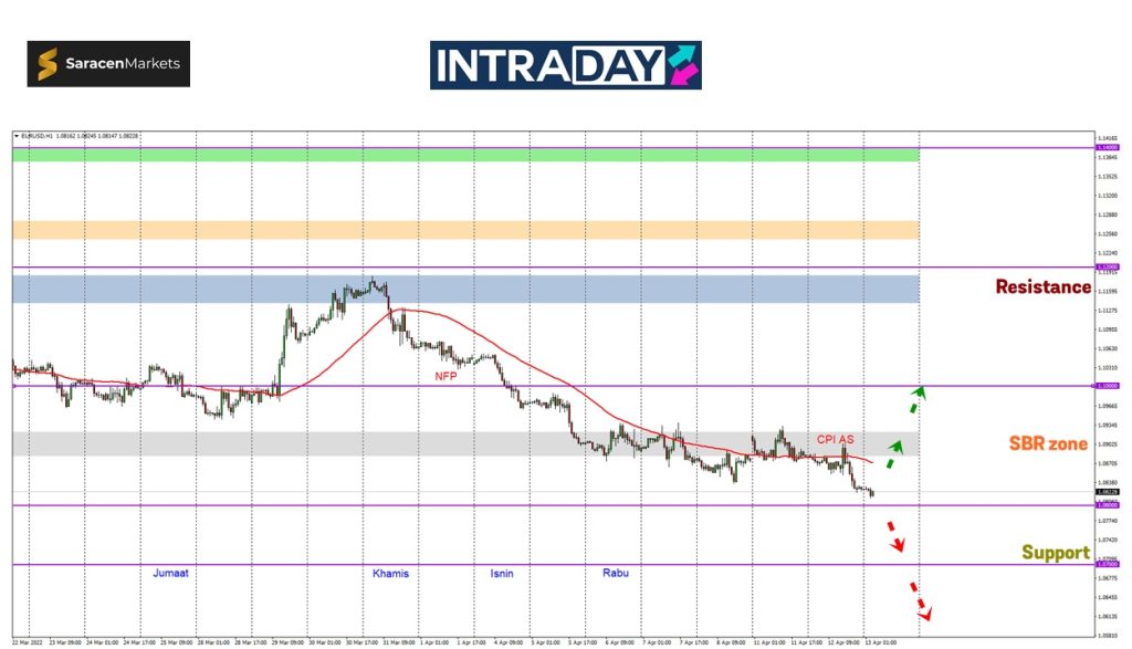 Penurunan sekitar 80 pips dicatatkan mencecah paras sekitar 1.08200 menunjukkan harga menyambung penurunan pada trend bearish yang masih melihatkan harga bergerak di bawah paras halangan Moving Average 50 (MA50) pada rangka masa 1 jam.