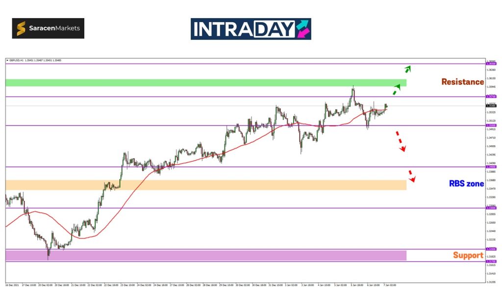 Penurunan harga sekiranya berjaya melepasi paras 1.35000, paras tumpuan adalah pada 1.34000 dan juga zon SBR (support become resistance) bagi penurunan yang diteruskan lebih rendah.