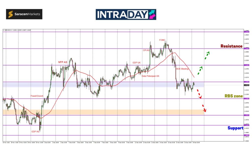 Namun jika harga berjaya melonjak lebih tinggi selepas melepasi rintangan 1.22000, harga berkemungkinan akan menuju ke paras 1.23000 dan isyarat perubahan trend akan dipantau.