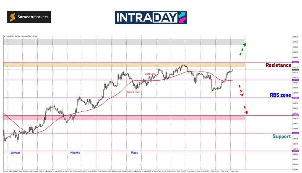 Jangkaan untuk harga meneruskan penurunan meleset, apabila harga yang melonjak di atas paras 1.07000 dan melepasi halangan Moving Average 50 (MA50) pada rangka masa 1 jam juga telah memberi isyarat perubahan trend harga semula.