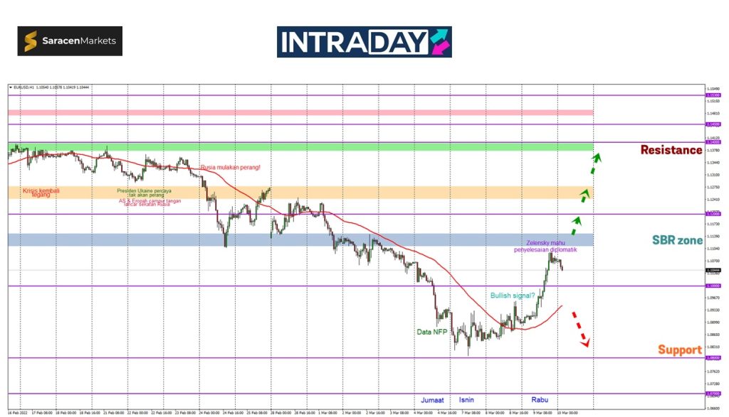 Jika penurunan berlaku, harga dilihat akan cuba melepasi paras 1.1000 dan menguji paras halangan MA50 untuk isyarat menyambung trend bearish semula.