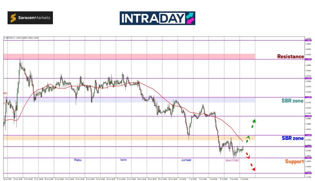 Seterusnya, zon SBR (support become resistance) 1.2000 pula akan menjadi rintangan buat harga pada corak kenaikan yang diteruskan sebelum jangkaan untuk harga ke paras lebih tinggi jika melepasi zon tersebut.