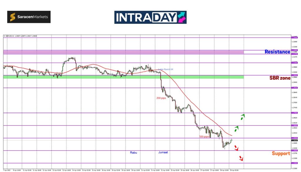 Penurunan yang diteruskan dilihat akan menguji zon support pada 1.24000 sebelum harga yang tembusi zon tersebut akan terus mencatatkan paras terendah terbaru 2 tahun.