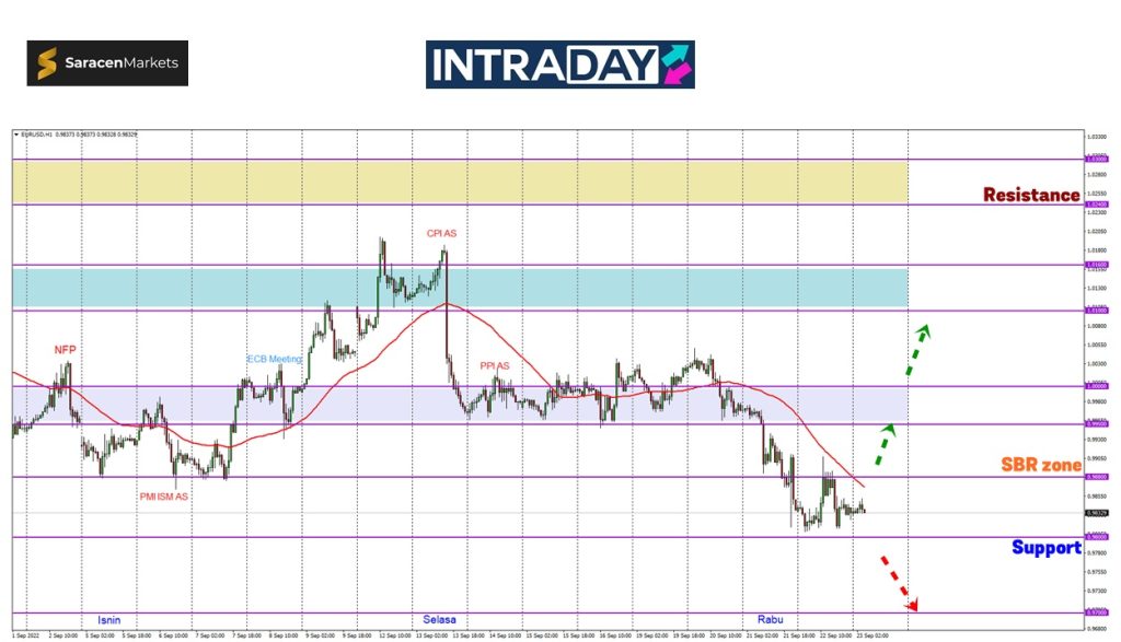 Pada carta harga pasangan mata wang EUR/USD semalam menyaksikan penurunan harga telah diteruskan sehingga ke zon support 0.98000 selepas kesan pengukuhan US dolar susulan kenaikan kadar faedah oleh Fed.