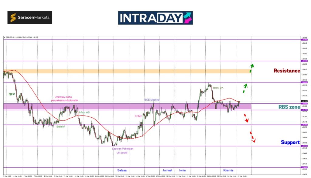 Pada carta harga pasangan mata wang GBP/USD, harga yang melonjak ke paras rintangan 1.33000 pada Selasa dan Rabu lalu kembali menyaksikan penurunan semula ke zon tumpuan 1.32000.