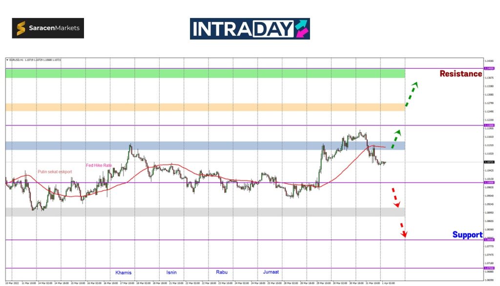 Sekiranya situasi penurunan harga berterusan dan jangkaan laporan NFP yang menyokong pengukuhan US dolar, harga boleh turun menguji semula sokongan di paras 1.10000.