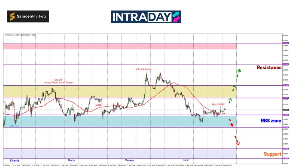 Pergerakan harga pada carta pasangan mata wang EUR/USD juga menyaksikan harga mendatar di atas paras sokongan semasa pada 1.01600 dan memberi petunjuk awal untuk perubahan arah sebelum ini.