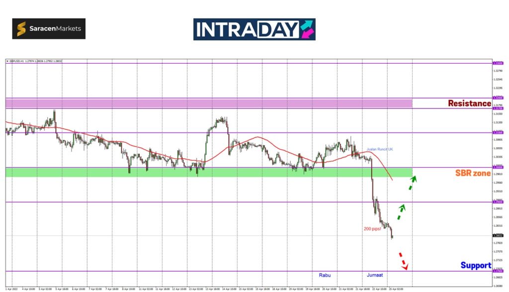 Setelah penurunan harga melewati zon support pada 1.3000, kejatuhan ketara harga sehingga 200 pips tersebut telah mencecah sehingga 1.28230 pada penutupan minggu tersebut.