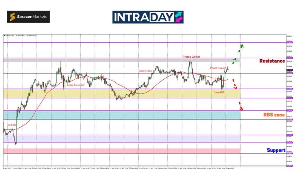 Sekali lagi paras 1.03000 berjaya melantunkan semula harga dan kenaikan lebih 100 pips ekoran reaksi ucapan Powell telah melepasi rintangan 1.04000.