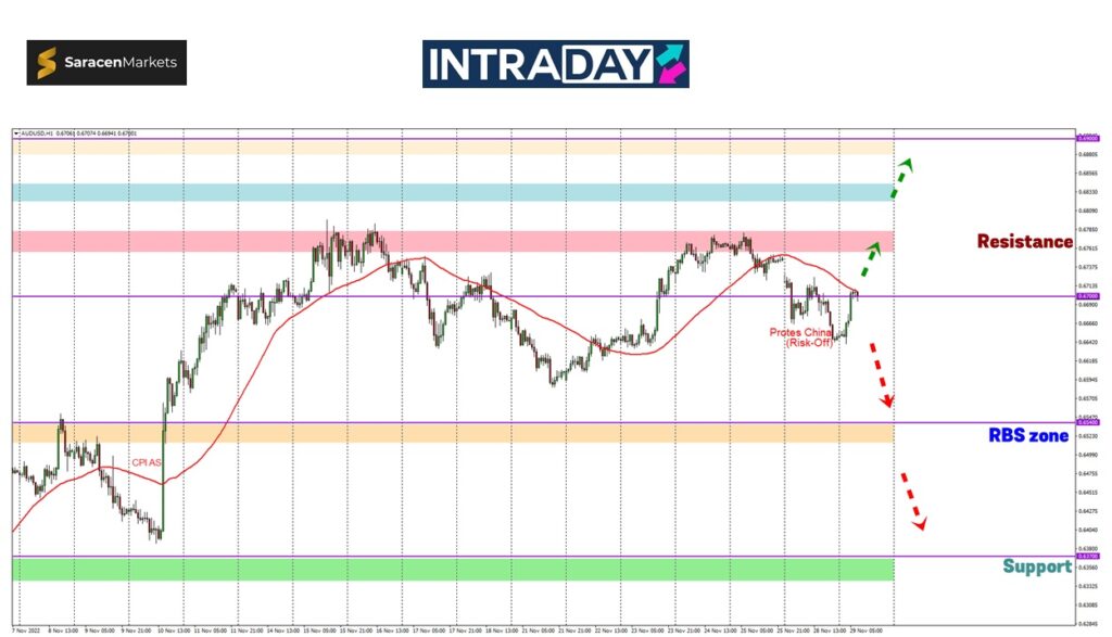 Dapat diperhatikan pada carta harga pasangan mata wang AUD/USD, penurunan harga berlaku pada Isnin semalam selepas pergerakan harga pada penghujung minggu lalu menampilkan corak mendatar di zon 0.67800.
