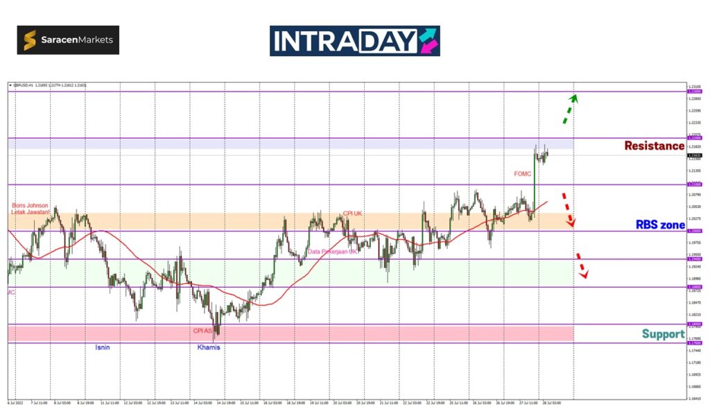 Jika harga meneruskan kenaikan dan menembusi zon rintangan pada 1.22000, sasaran seterusnya harga berkemungkinan akan mencapai ketinggian 1.23000 pada pergerakan trend bullish yang diteruskan.