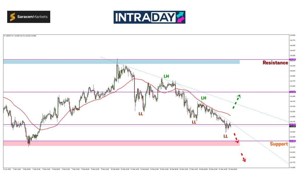 Penurunan lebih rendah bakal dijangkakan untuk harga menuju ke zon support pada 114.300-114.200 yang sebelum ini diuji pada awal Februari lalu.