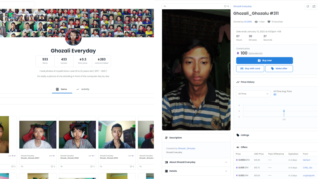 Seorang pemuda sederhana Indonesia, Ghozali Ghozalo telah memuatnaik 1,000 selfies sebagai non-fungible token (NFT) di platform OpenSea dan dalam tempoh dua hari, koleksinya itu berjaya mencecah nilai hampir 1 ETH (RM14,039) daripada harga lantai bernilai $3 (RM12.53).
