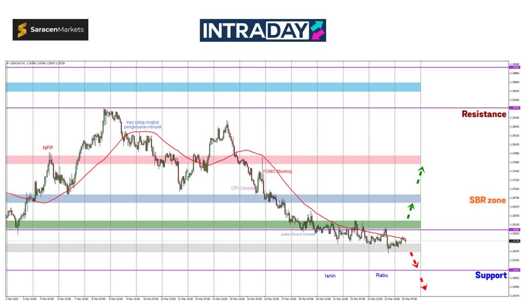 Sehingga dagangan Rabu semalam, penurunan harga telah mencecah sekitar 1.25400 dan berlegar di bawah paras halangan Moving Average 50 (MA50) pada rangka masa 1 jam.