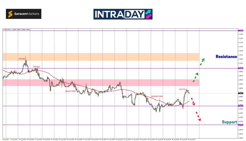 Sebaliknya jika berlaku penurunan semula harga, paras 1.08000 akan kembali dituju dan reaksi harga pada sekitar itu akan diperhatikan.