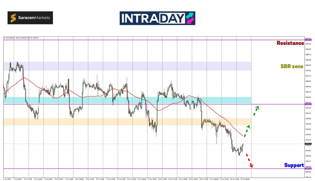 Jika penurunan diteruskan, harga dilihat akan menuju paras sasaran utama pada 1900.00 yang berpotensi menjadi paras sokongan buat emas.