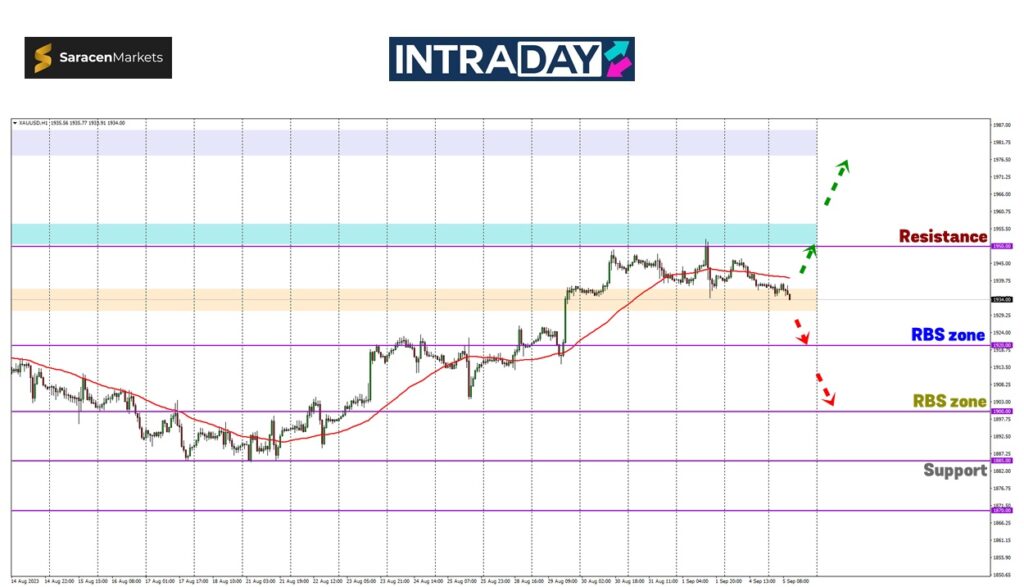 Jika harga susut di bawah paras 1930.00, ini akan menjadi petanda untuk penurunan lebih rendah harga bakal diteruskan menuju zon RBS (resistance become support) pada 1920.00.