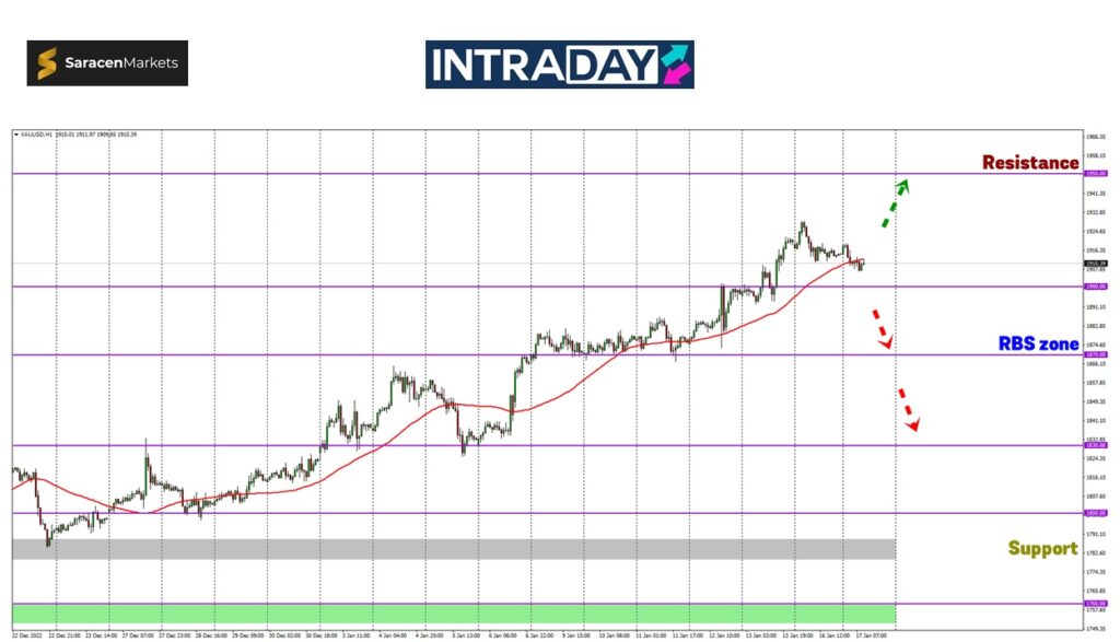 Corak penurunan akan lebih jelas dipamerkan sekiranya harga mula bergerak turun di bawah paras penting 1900.00 yang dijangka akan menjadi sokongan buat harga.