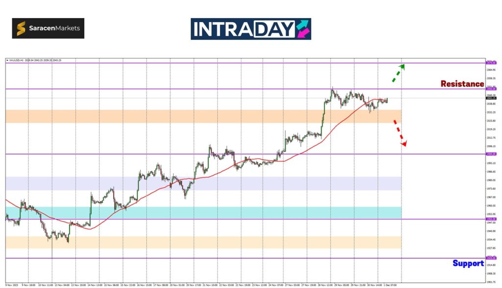 Penurunan harga di sesi New York semalam mencecah sekitar 2031.00 tetapi harga melantun semula sedikit sebelum mendatar di sekitar 2040.00 sehingga ke sesi Eropah petang ini sambil menguji halangan MA50.