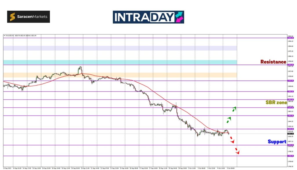 Jika penurunan berlaku melepasi paras sokongan beberapa hari lalu, harga emas dilihat akan mencecah ke paras 1800.00.