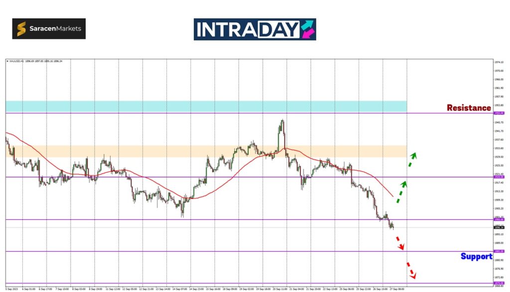 Jika bertukar bullish, harga emas berkemungkinan akan bergerak di atas 1900.00 semula sebelum menuju kembali ke paras tumpuan 1920.00 sebelum ini.
