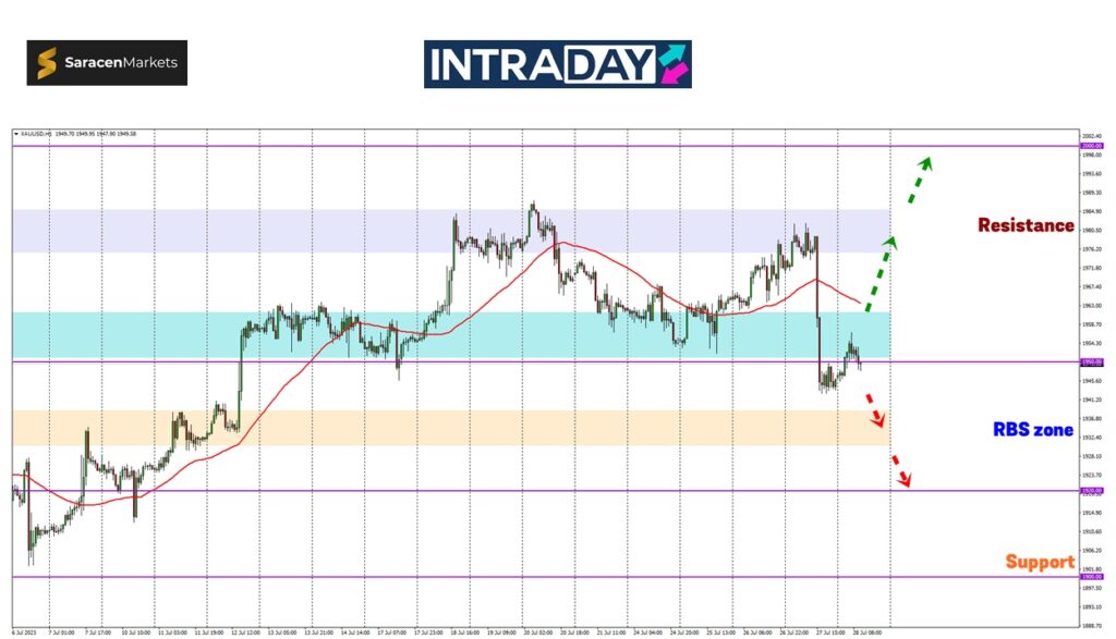 Harga boleh melanjutkan lagi penurunan menuju zon RBS (resistance become support) 1930.00 sebelum menjejaki ke paras 1920.00.