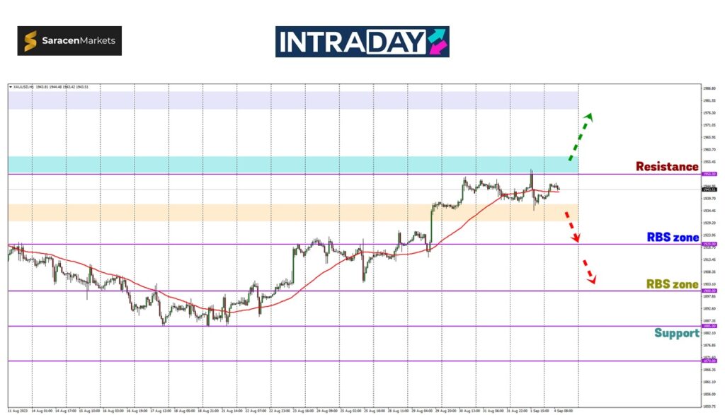 Sebaliknya jika harga emas menjunam lebih parah minggu ini, harga berkemungkinan akan melepasi paras 1930.00 dan menuju zon RBS (resistance become support) pada 1920.00.