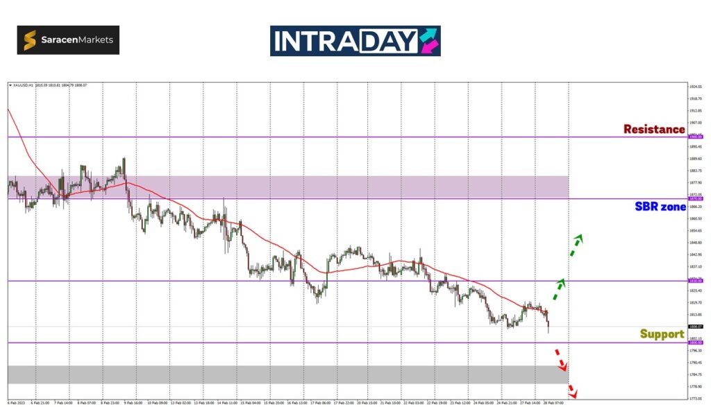 Sasaran adalah untuk harga menuju zon support utama pada 1800.00. Zon ini mungkin bakal ditembusi sekiranya US dolar terus kukuh menekan harga jatuh lebih rendah.