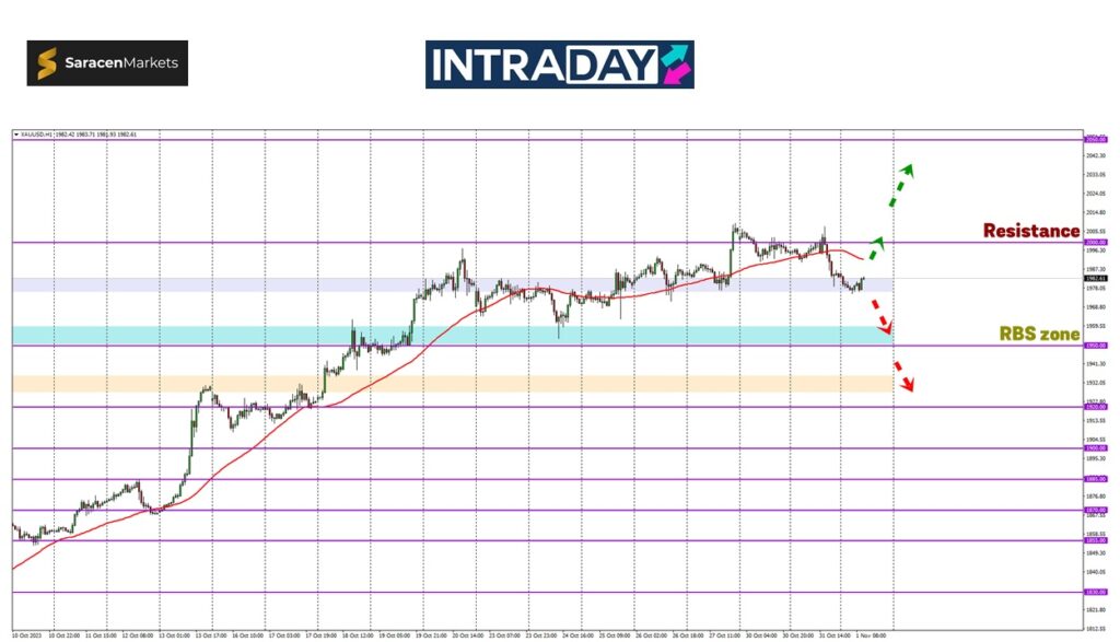Sekiranya harga emas terus menjunam lebih rendah, tumpuan seterusnya untuk dituju adalah pada zon RBS (resistance become support) 1950.00.