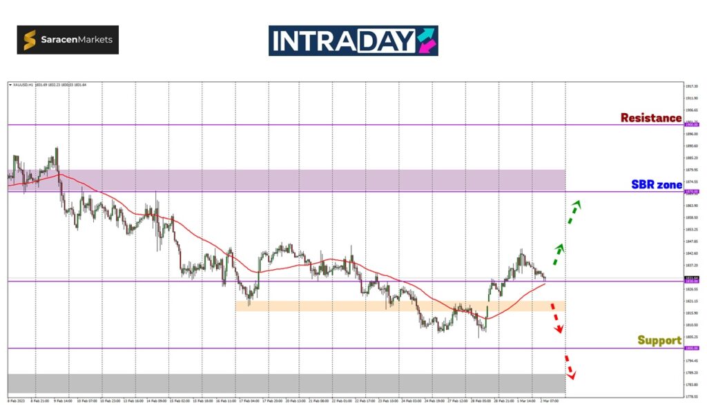 Pada carta harga XAU/USD yang mengukur nilai emas berbanding US dolar telah menyaksikan kenaikan harga yang berjaya melepasi rintangan 1830.00.