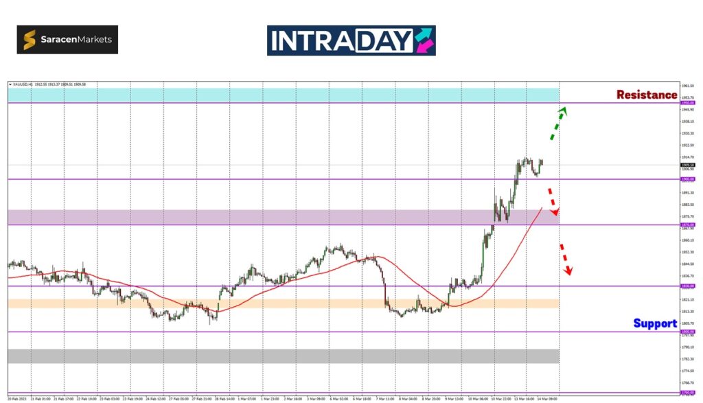 Carta harga XAU/USD yang mengukur nilai emas berbanding US dolar menyaksikan corak kenaikan pada Isnin semalam diteruskan menembusi zon 1900.00 susulan lonjakan ke paras 1870.00 Jumaat lalu.