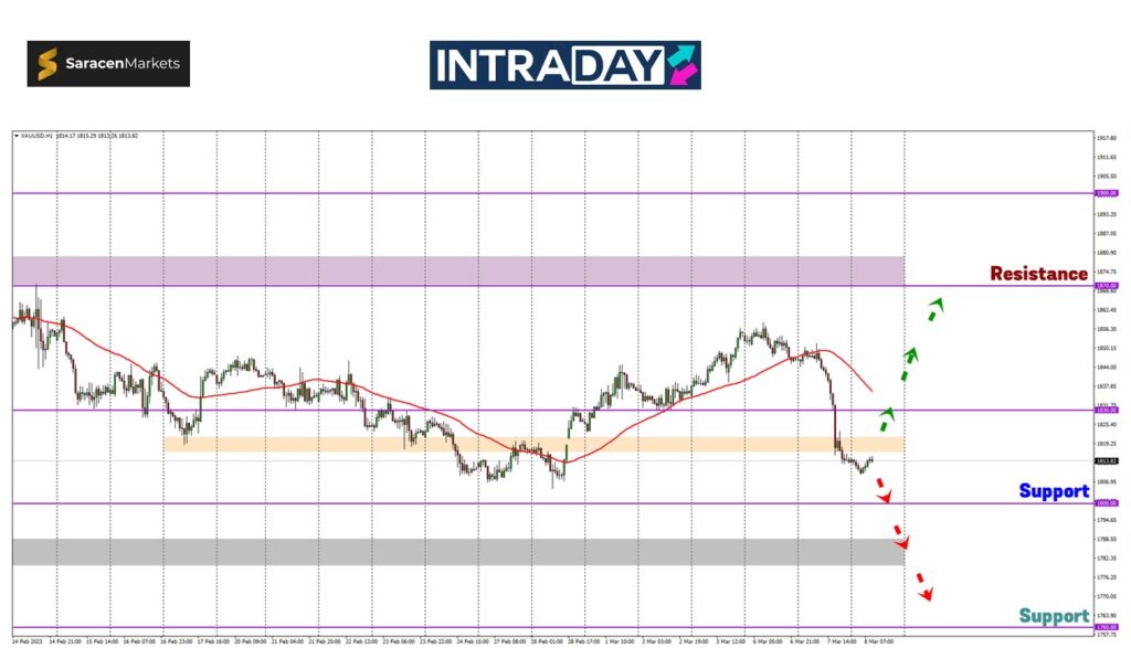 Berjaya melepasi ke paras lebih tinggi akan memberi isyarat perubahan trend bullish semula buat emas dan bakal mencabar ketinggian dicapai awal minggu sekitar 1850.00.