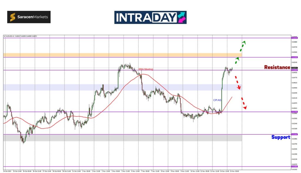 Meneliti carta AUD/USD, setelah harga menguji paras sokongan Moving Average 50 (MA50) pada rangka masa 1 jam di sekitar paras 0.63700, harga kemudiannya melonjak sekitar 140 pips hingga mencapai ke zon 0.65000.