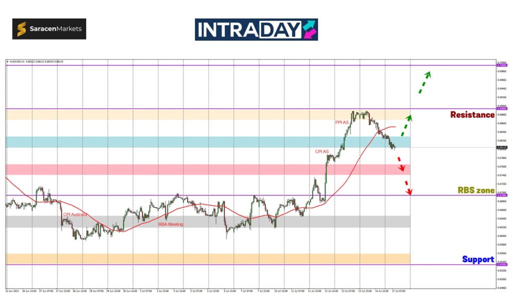 Jika penurunan diteruskan lebih rendah pada sesi-sesi berikutnya, harga akan singgah ke sekitar 0.67500 sebelum menguji pula zon RBS (resistance become support) 0.67000.