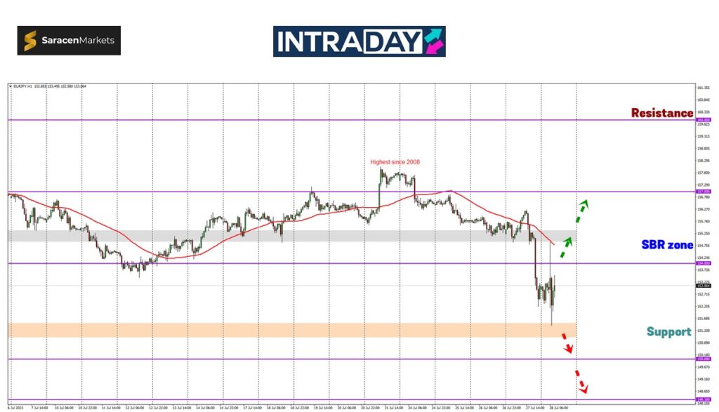 Namun sekiranya berlaku lonjakan semula harga, zon 154.00 dilihat akan menjadi rintangan terhampir untuk diuji atau harga akan menuju semula paras dicapai ketika lonjakan di sesi Asia pagi tadi.