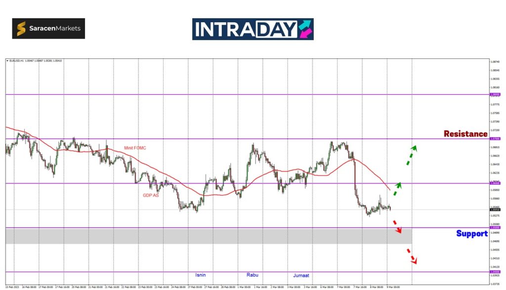 Sekiranya kenaikan berlaku, antara paras awal yang perlu diberi perhatian adalah pada 1.06000 selain harga juga akan menguji halangan Moving Average 50 (MA50) pada pergerakan rangka masa 1 jam carta EUR/USD.