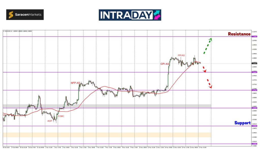 Jika diperhatikan pada carta pasangan mata wang EUR/USD, pergerakan harga berlegar dalam zon mendatar antara julat 1.08900 dan 1.08300.