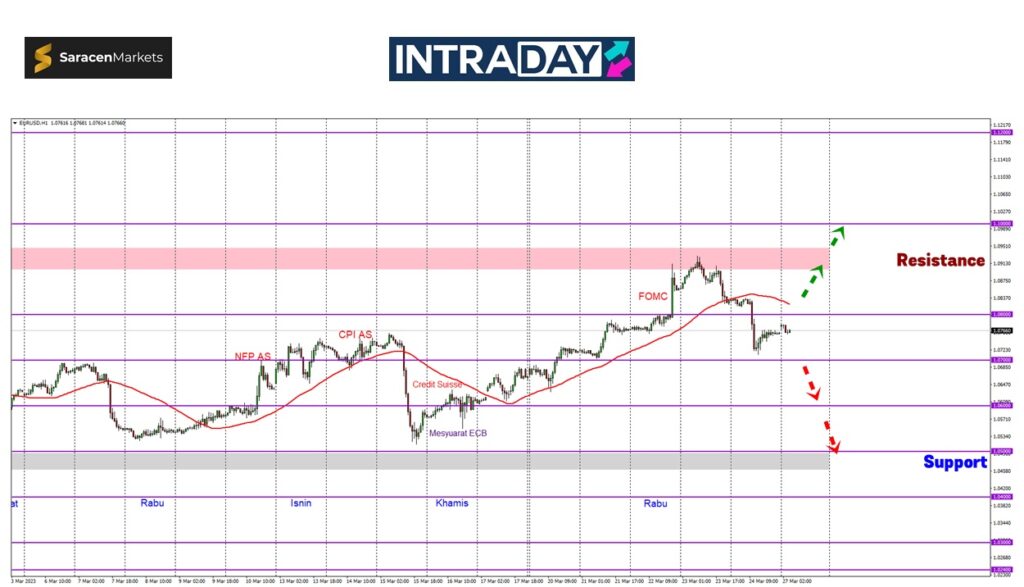 Jika corak penurunan tersebut berjaya dikekalkan, harga berkemungkinan akan bergerak melepasi paras 1.07000 sebelum menuju pula ke sekitar 1.06000.