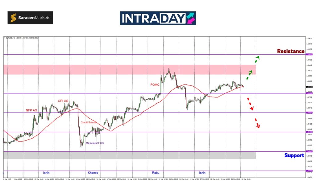 Pada carta harga pasangan EUR/USD, harga dilihat telah membuat kenaikan di sesi Eropah mencapai ketinggian 1.08700, namun kembali ditekan semula di sesi berikutnya.