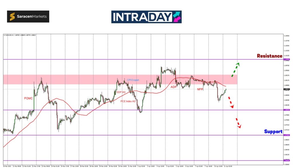 Seterusnya, harga dilihat akan menuju zon sokongan pada 1.08000 dan jika tembus lebih rendah, boleh mencecah hingga sekitar 1.07000.