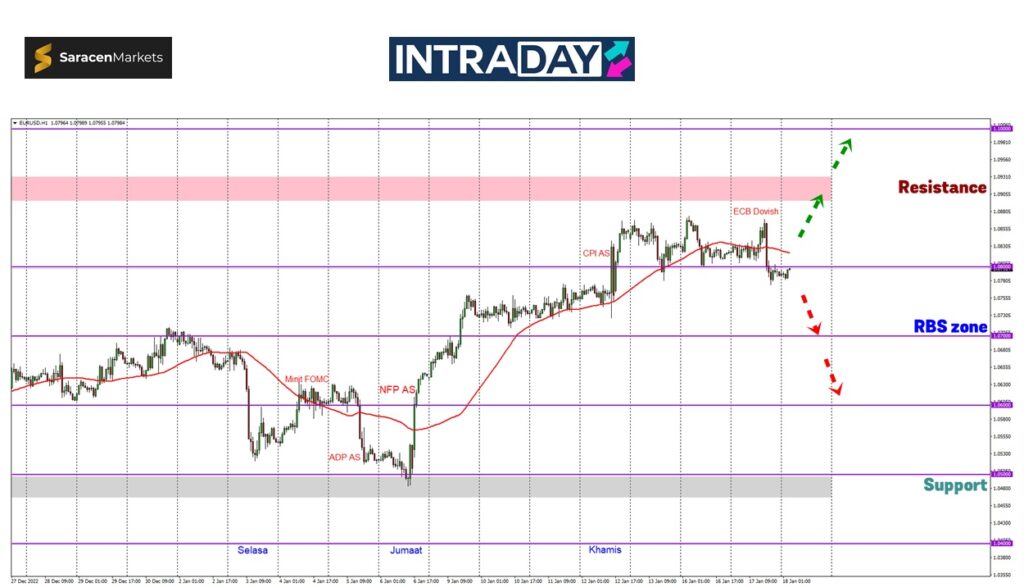 Sebaliknya, jika harga kembali melonjak semula dari zon 1.08000, ketinggian mingguan yang dicapai berkemungkinan mampu diatasi sebelum harga menguji zon rintangan 1.09000.